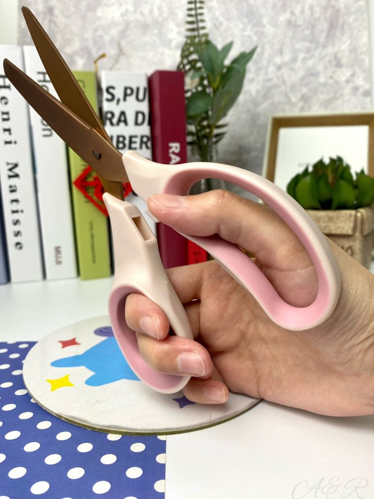 屬中大型的剪刀,一開始看到,會覺得感覺可能會有點重,擔心長時間使用手會很吃力,但實際拿起後,意外輕盈,握柄的觸感是柔順的+上握柄的設計,讓長時間使用也很舒適。