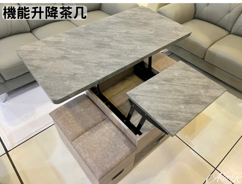 客廳桌部分「機能升降款」在這也有! 這款就很符合寶家的需求,不論是當對開工作桌/全開餐桌都可以,四個板凳皆有收納功能,收納功能十足~